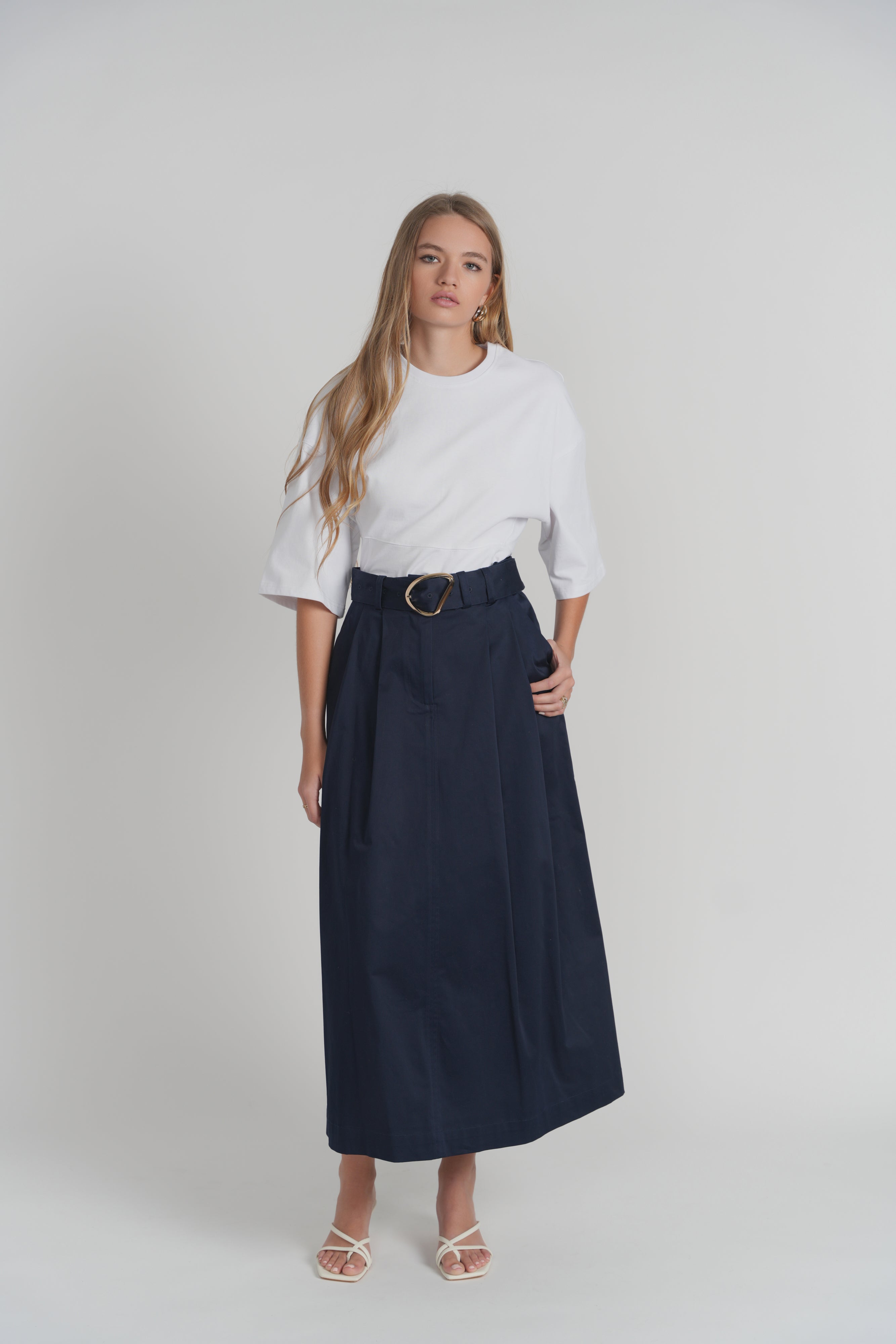 The Luum Corsica Navy Pocket and Belted Skirt combines functionality with style, featuring a classic navy color. It includes two side pockets, enhancing practicality for everyday use, while the included belt with a gold buckle adds a sophisticated touch. This design balances utility and elegance effectively.Discounted products are not returnable or exchangeable