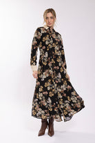 Experience elegance and sophistication with the Soie Floral Chiffon Shirtdress. Made with delicate black chiffon and adorned with a vibrant floral print, this dress is the perfect combination of style and comfort. The white collar and cuff add a touch of contrast, making this dress a must-have for any occasion.