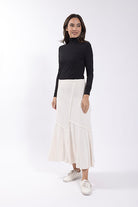 Expertly crafted with corduroy panels in classic black and ivory, our Static Corduroy Panel Skirt is a versatile addition to your wardrobe. The high-quality material and stylish design ensure a comfortable fit and timeless style for any occasion. Elevate your look with this must-have skirt.