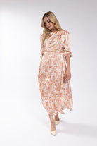 This peach color paisley and floral printed dress features a 3/4 sleeve and an overlap under the waist. Perfect for any occasion, this dress offers a modern and elegant look. Dress it up or down, this versatile piece will surely become a staple in your wardrobe.Discounted products are not returnable or exchangeable