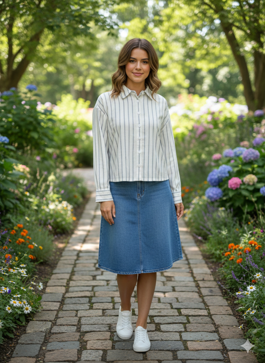 The Concept Double Stripe Shirt is an ivory crop shirt featuring double blue stripes, designed for a modern aesthetic. This combination of colors provides a versatile style suitable for various occasions, enhancing the wearer's wardrobe with a contemporary touch. Its cropped design allows for easy layering and comfortable wear. Discounted products are not returnable or exchangeable