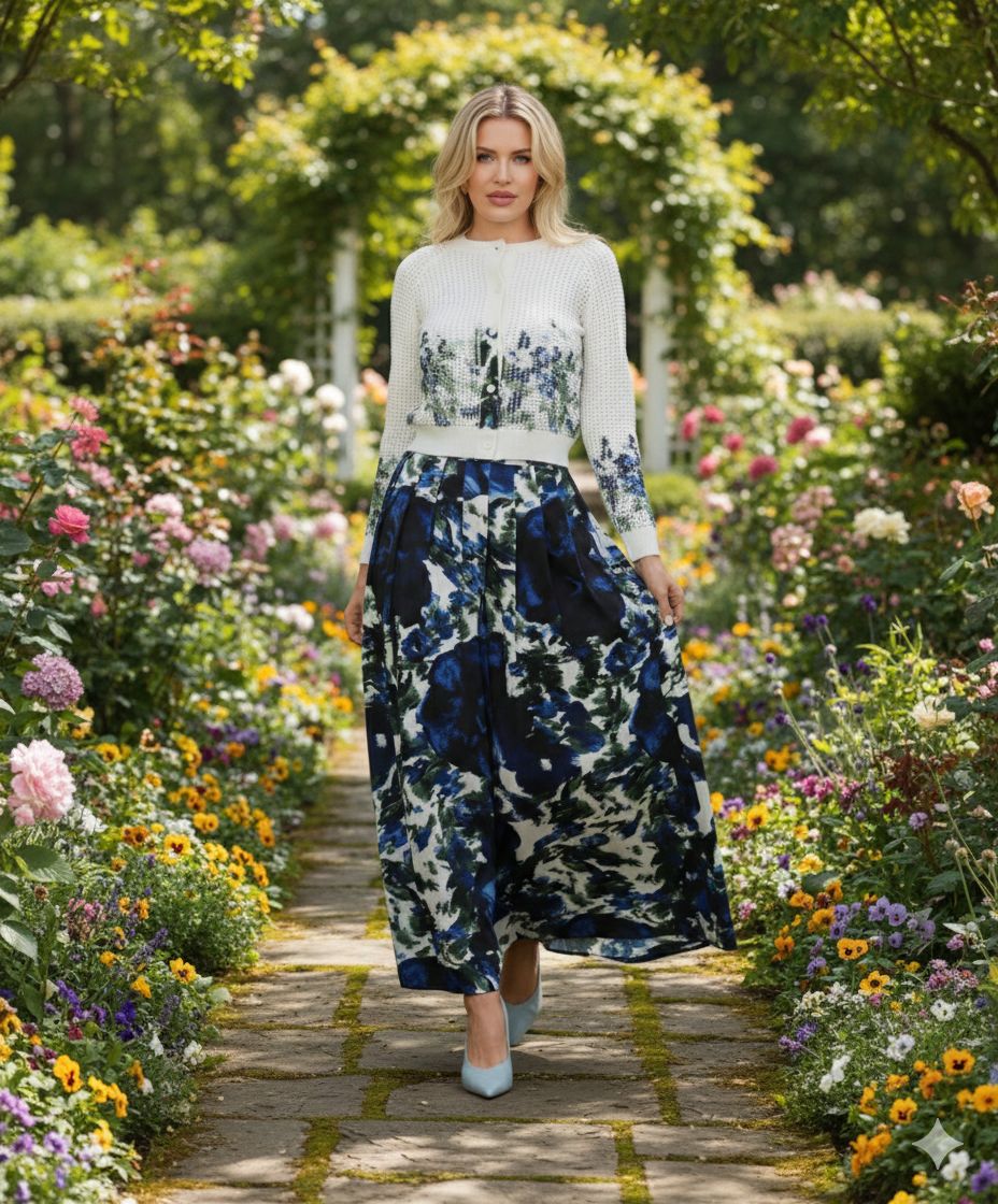 The Birt Printed Pleated Crochet Maxi Set features a cream crochet cardigan adorned with a distinctive green and blue design, complemented by a maxi pleated skirt showcasing a harmonious color palette of cream, blue, and green. This set offers an elegant, layered look suitable for various occasions. Note that discounted items are final sale and not eligible for return or exchange.