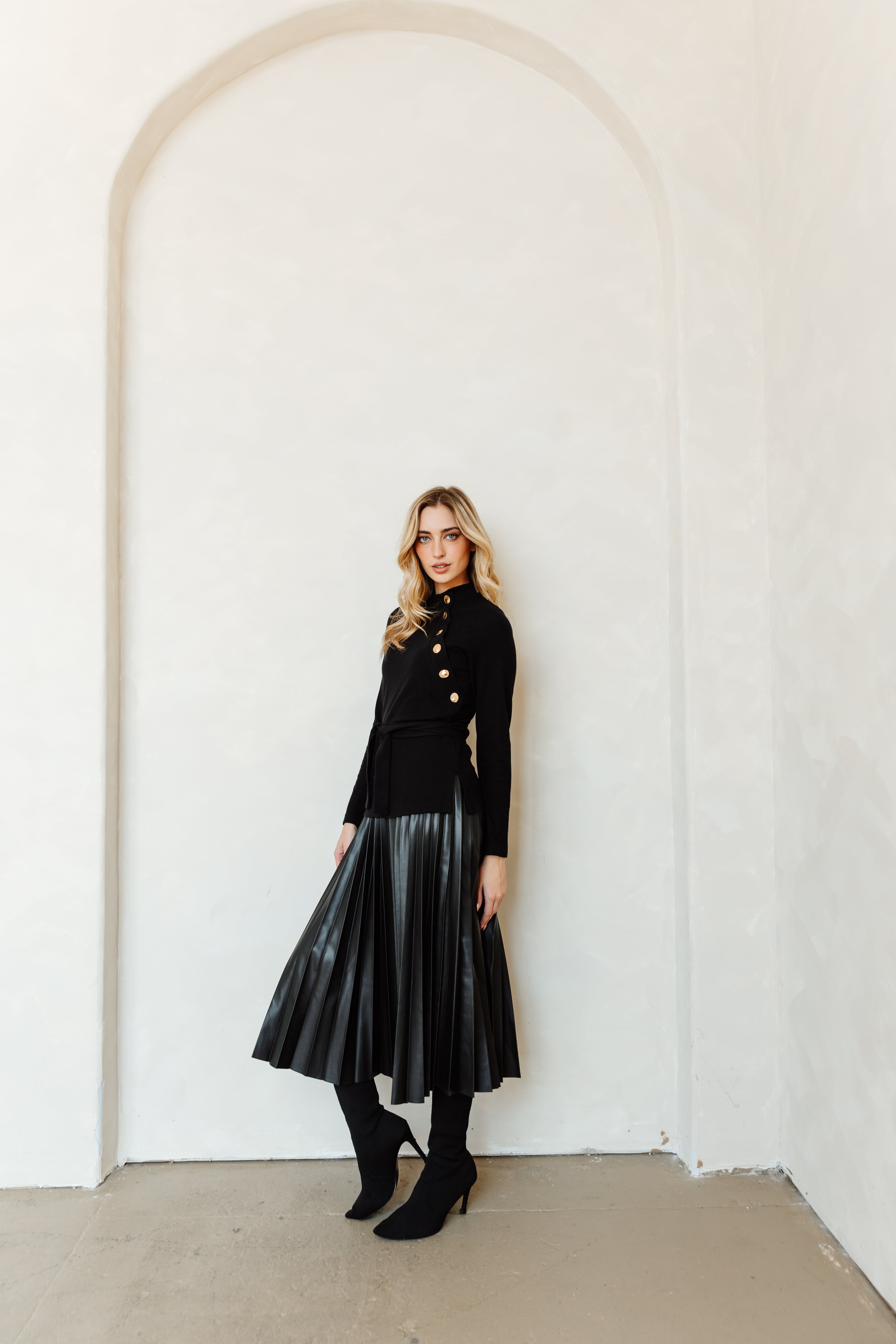 Introducing the Anika Knit Leather Dress—a perfect fusion of knit and vegan leather that offers both style and versatility. This elegant piece seamlessly combines the softness of knit with the sleek sophistication of vegan leather, creating a look that is both chic and contemporary. Designed for versatility, the Anika Dress can be effortlessly dressed up for formal occasions or styled down for a more casual look. Experience the beauty, elegance, and comfort of this unique dress that adapts to any setting with ease.
