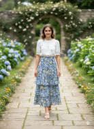 Expertly crafted from soft, breathable cotton, the Adina Skirt boasts a playful floral ruffle design in vibrant blue and yellow hues. Perfect for adding a touch of femininity to any outfit, this must-have piece will keep you stylish and comfortable all day long. Floral ruffle skirt