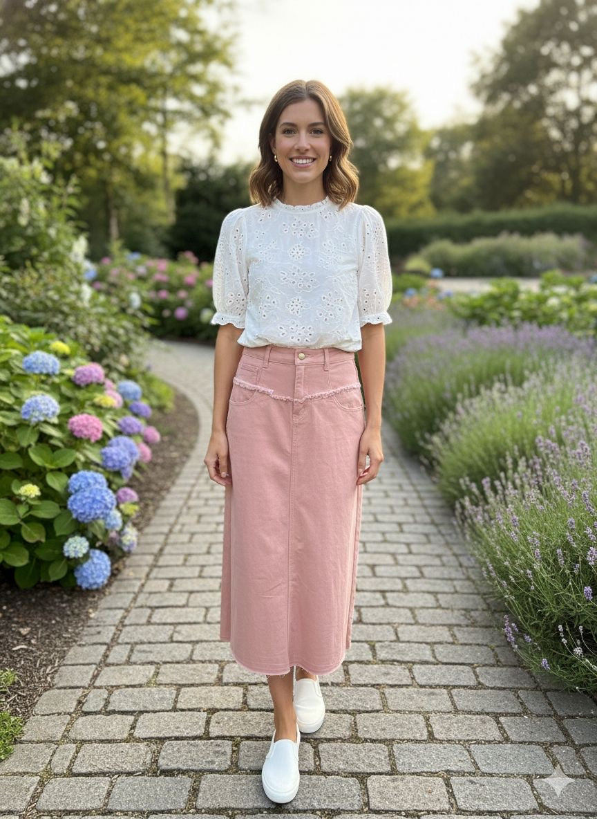 Adina Fray Denim Skirt in Peachy Pink
