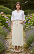 Discover the versatile style of our Adina Fray Denim Skirt in Beige. Crafted from soft beige denim, this skirt features frayed edges on the bottom for a touch of edge. Perfect for any occasion, dress it up or down for a chic and on-trend look.Discounted products are not returnable or exchangeable