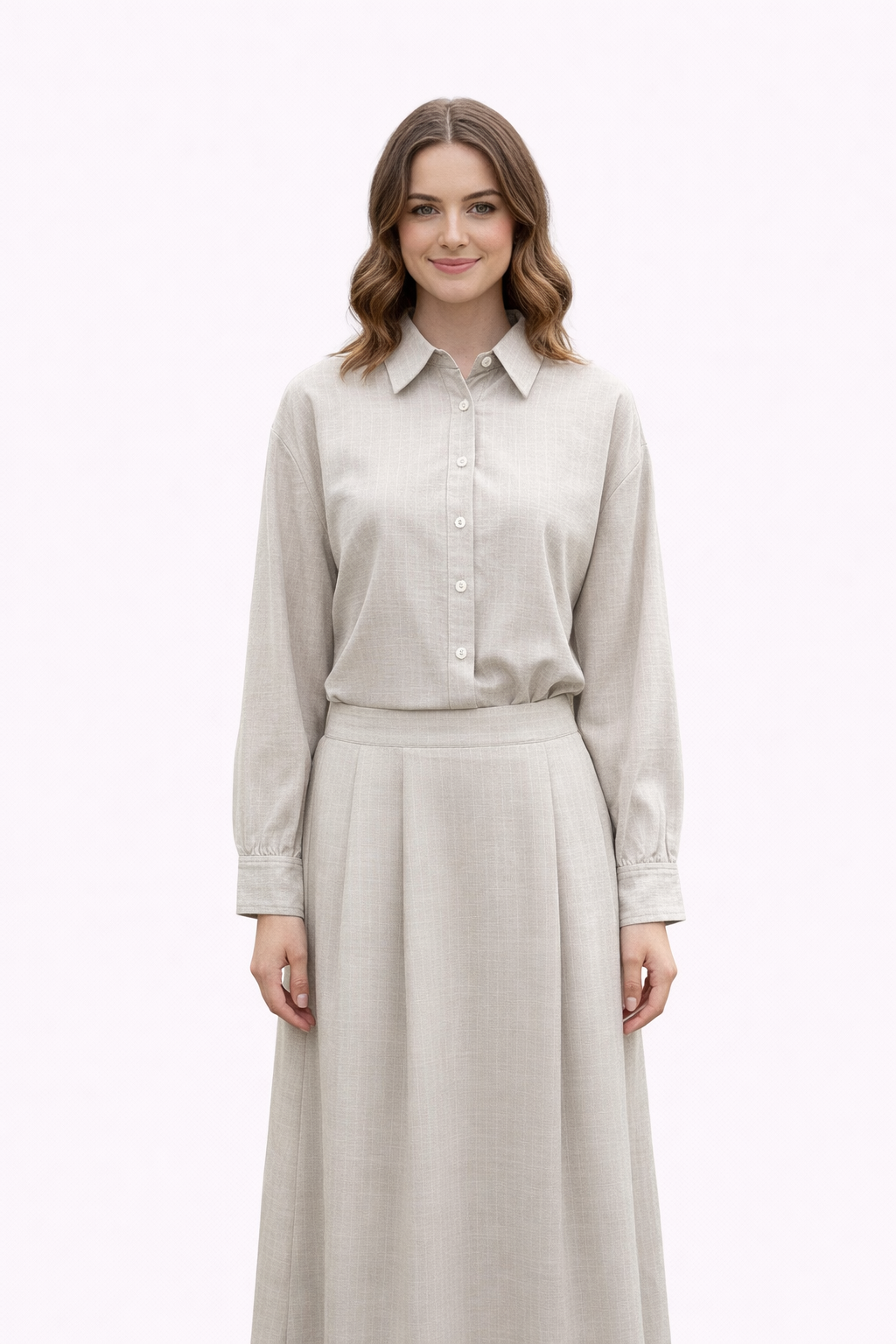 The Concept Pinstripe Grid Blouse features a beige fabric adorned with white pinstripes, offering a sophisticated contrast. This crop blouse allows for versatile styling, particularly when paired with the coordinating skirt, enhancing the overall aesthetic. Discounted products are not returnable or exchangeable