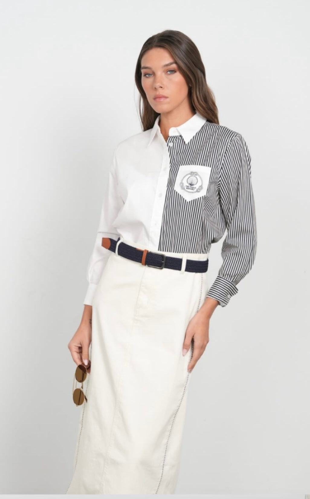The Point Navy Half Stripe Button Up Shirt features a sophisticated design with half navy and white stripes and a solid white counterpart, extending to the back for a cohesive look. With a functional front pocket, this shirt combines style with practicality, making it suitable for both professional and casual settings.Discounted products are not returnable or exchangeable