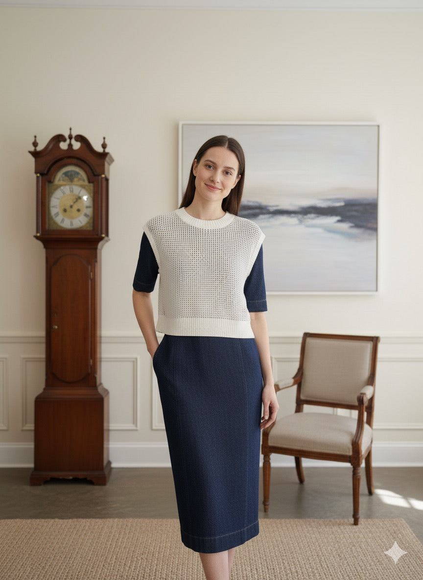 Experience chic comfort with our Point Wide Knit Vest. The dusty blue, black, and cream design features a wide knit with unique holes, perfect for adding a touch of edge to any outfit. Made with quality materials for lasting wear. Discounted products are not returnable or exchangeable